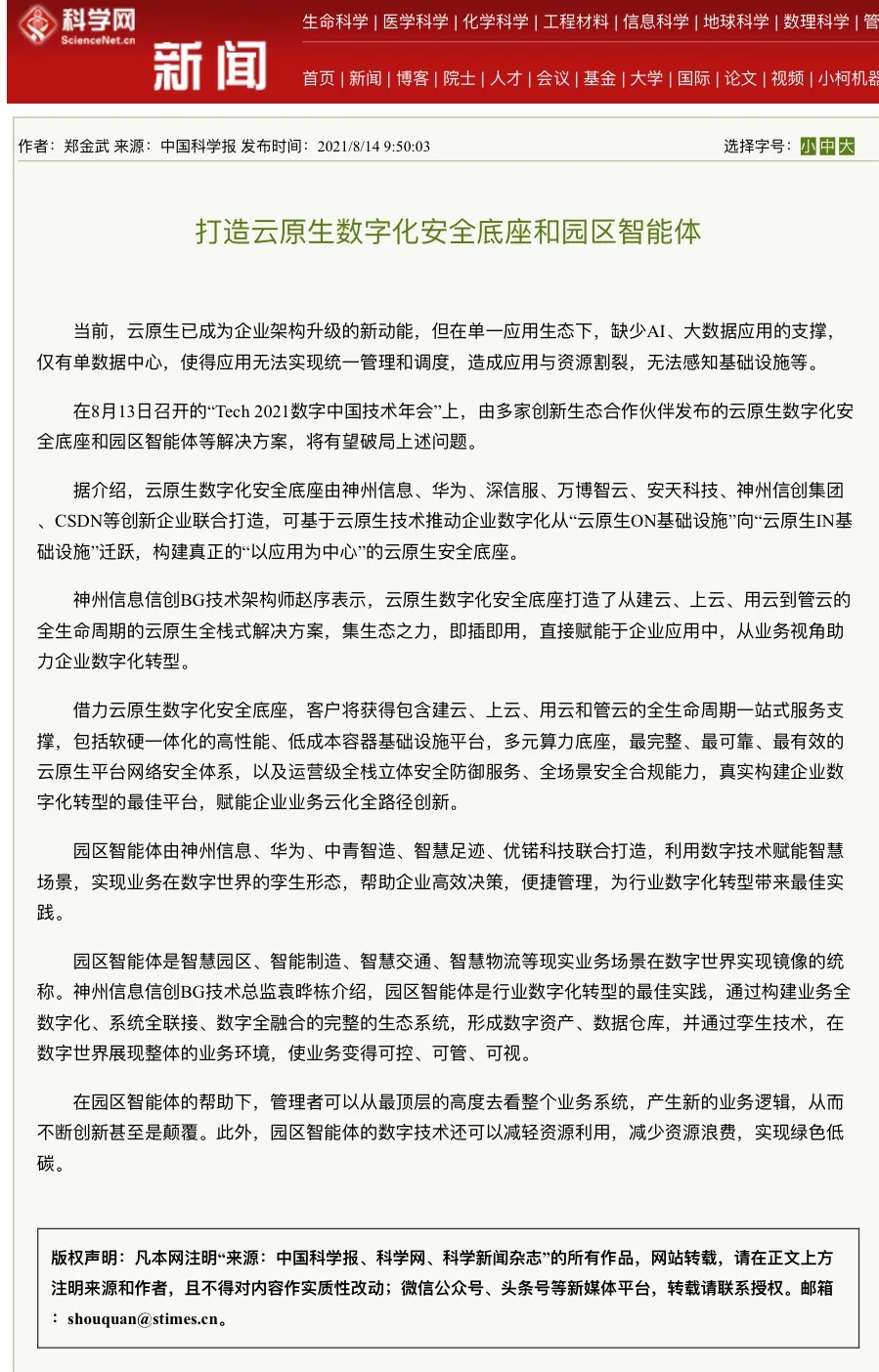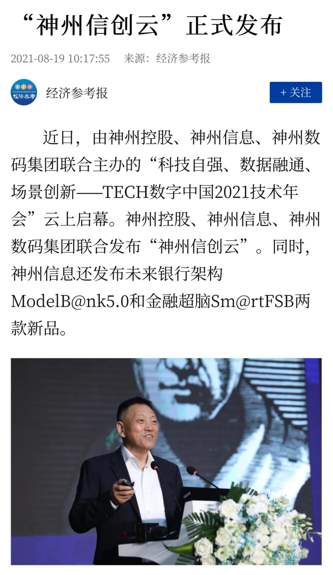 8月12日,由神州控股、BB贝博艾弗森官网、bb贝博艾弗森集团联合主办的“科技自强、数据融通、场景创新——TECH数字中国 2021技术年会”云上盛大启幕,发布神州信创云、ModelB@nk5.0、金融超脑Sm@rtFSB、云原生数字化安全底座、园区智能体等重磅产品,国内各大权威、影响力媒体多角度多频次对盛况进行报道!