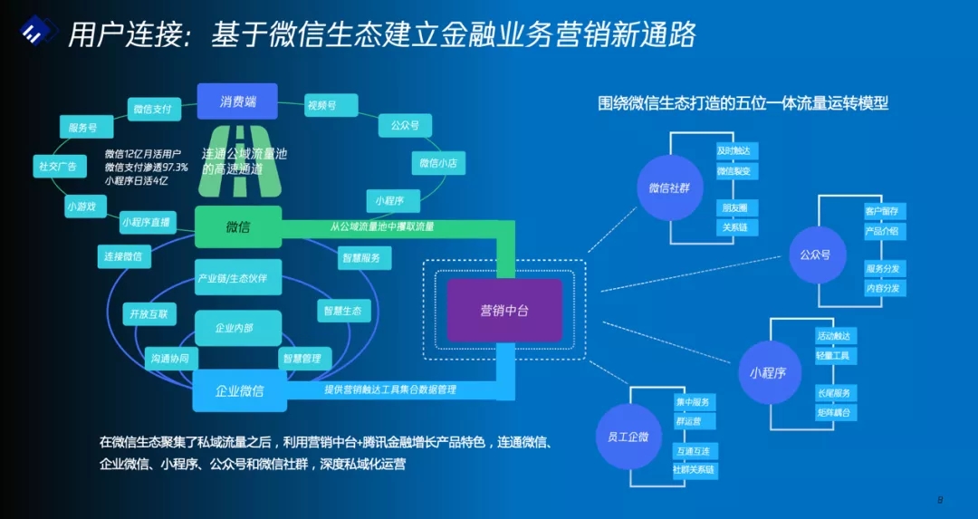 在零售用户的连接及拓展运营中,可以基于微信生态加速银行私域流量的聚集后,通过营销中台连通微信、企业微信、小程序、公众号和微信社群,深度开展私域化运营,并基于产品服务层和用户旅程层为用户提供特色化的金融产品和旅程式的用户服务。